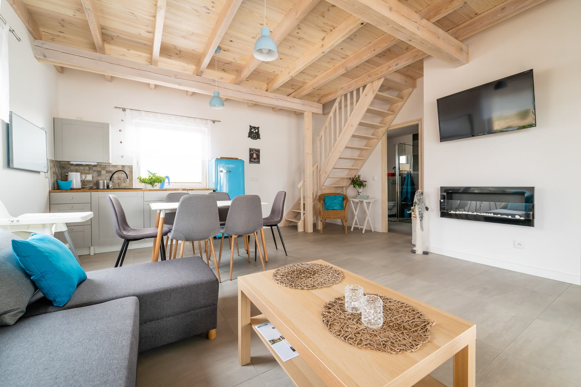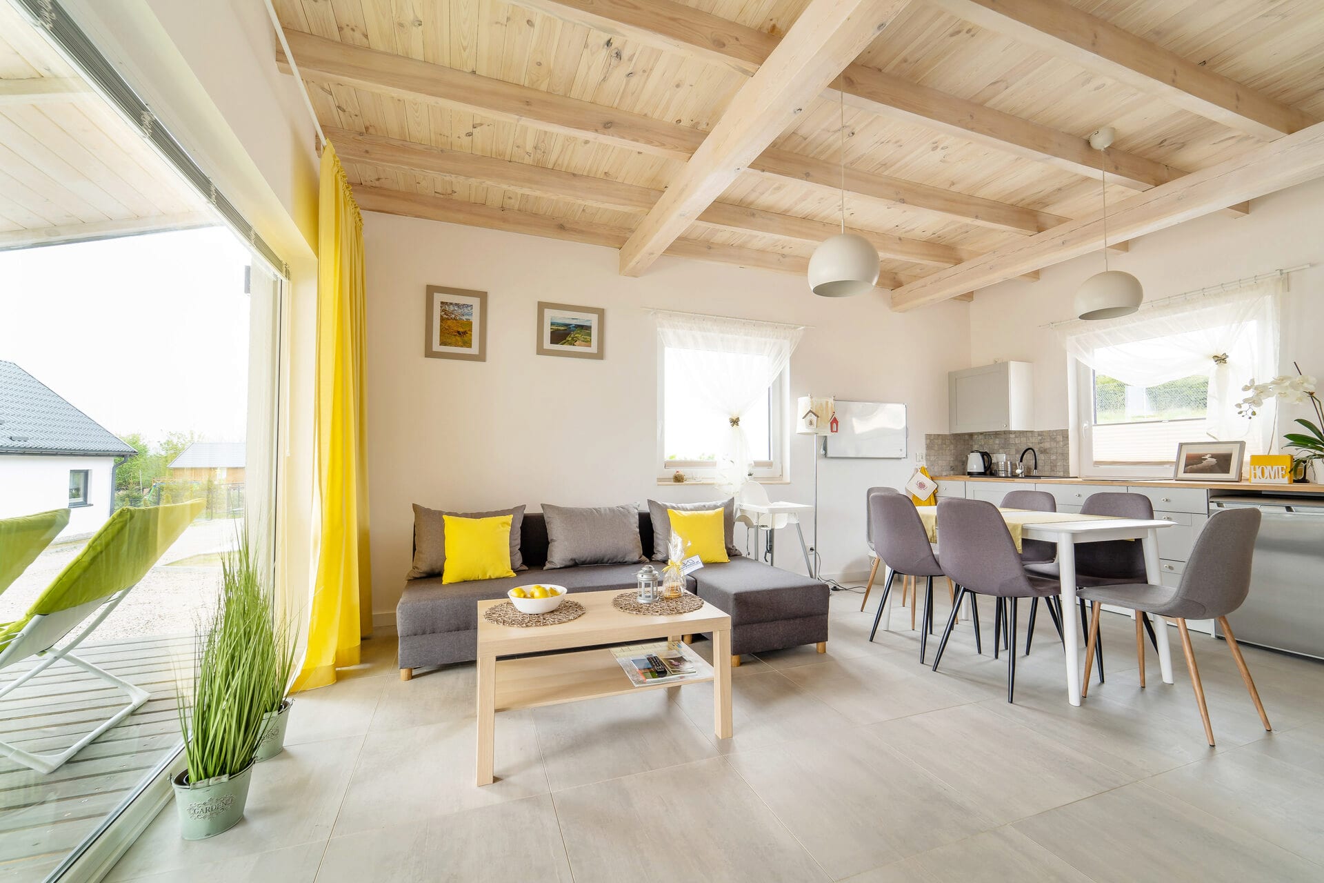 Nasze domki posiadają salon z aneksem kuchennym, trzy przestronne sypialnie (jedna na parterze, dwie na poddaszu), dużą łazienkę oraz taras. Dokładamy wszelkich starań, by zaspokoić najbardziej wymagających gości.
